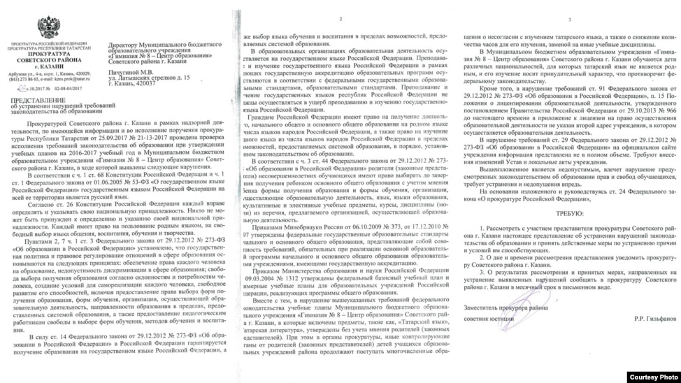 Потом появилось представление прокуратуры Советского района Казани, которая потребовала исключить татарский язык из обязательной программы в одной из школ столицы РТ. В нем также сказано, что проверка проведена "в рамках надзорной деятельности, по имеющейся информации и во исполнение поручения прокуратуры Татарстана от 25 сентября 2017 года №21-13-2017".